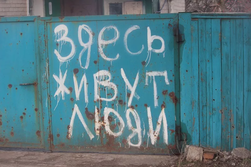 Красный партизан – в прошлой жизни благоустроенный посёлок с двумя птицефабриками и населением в тысячу человек, а сейчас здесь только 350 жителей. Обе птицефабрики закрылись ещё при украинской власти, одна в 1996-м, другая в 2002 году. В разгар боевых действий позиции находились в полукилометре от посёлка. На въезде в него – сожжённый магазин. На дороге – такая же АЗС.