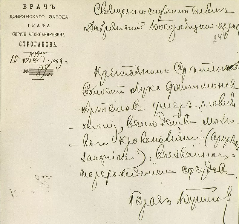 Присутствует в документах конца XIX века и бланк врача Добрянского завода А.К. Бутковского.